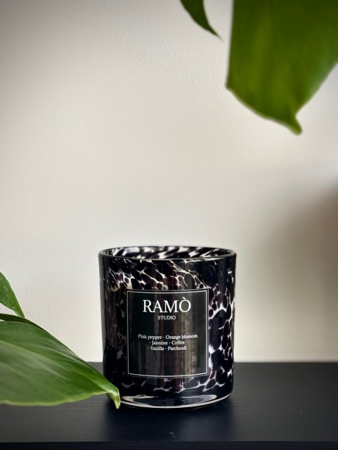 Lys håndstøpt på Sunnmøre i svartprintet glass med duft, inspirert av dem ikoniske YSL duften - Opium black. Fremstilt av kokkosvoks, og har en størrelse på 370g.