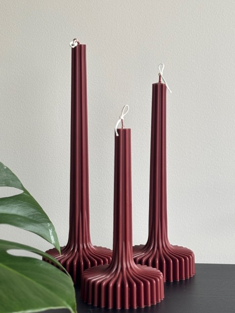 Søyleformet lys med riller i tre ulike størrelser. Hvert lys er nøye håndstøpt i en nydelig, høstlig burgunderfarge. Den karakteristiske riflede basen gir et moderne og skulpturelt uttrykk – perfekt som dekorasjon i både hverdagen og til spesielle anledninger.